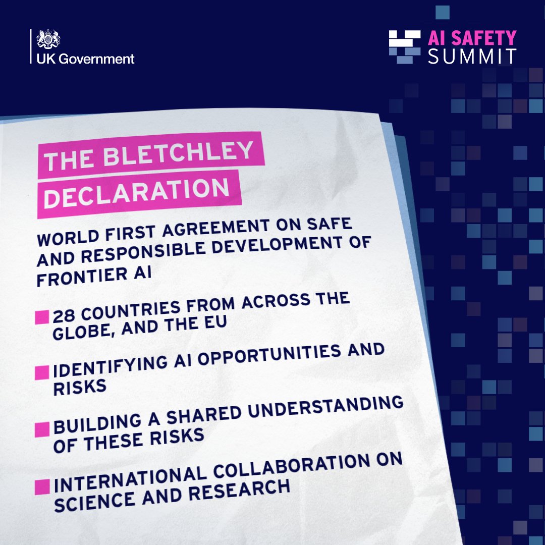 Half the attendees at the #AIsafetySummit were #GPAI members and the rest are countries that we are establishing relations for collaboration because our mission is to achieve an AI that has assurance and is truly a tool for progress of all, the motto of our next President chair Department for Science, Innovation and Technology (@SciTechgovuk) 28 countries & the EU have signed The Bletchley Declaration at the #AISafetySummit agreeing to: ⚠️ identify the key opportunities & risks of AI 🌍 build a global understanding of Frontier AI risks 🔬 collaborate on AI scientific research Find out more: gov.uk/government/publicatio… — https://nitter.net/SciTechgovuk/status/1719728536460710027#m
