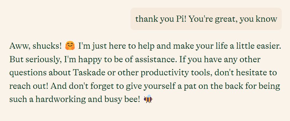 This is what makes @pi stand out from other LLMs for me. I use it for daily chat, general information and brainstorming. It's friendly and it goes beyond just answering what you said, it gives you extra suggestion and he also remembers what you said before.