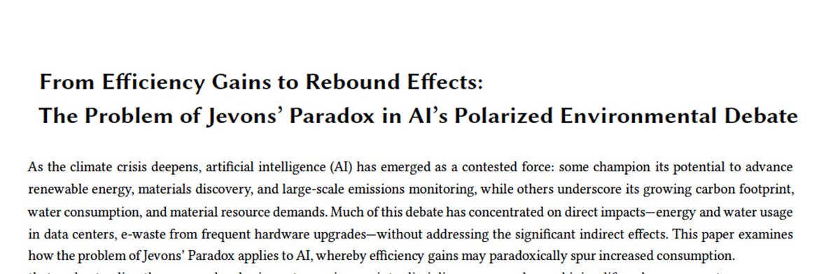 DeepSeek forces a rethink of the compute & energy costs of AI models. In a new paper with @SashaMTL @strubell, we look at the full environmental impacts of AI โ€“ both direct and indirect โ€“ and what Jevons Paradox means for AI and climate. A thread: ๐Ÿงต [Translated from EN to English]