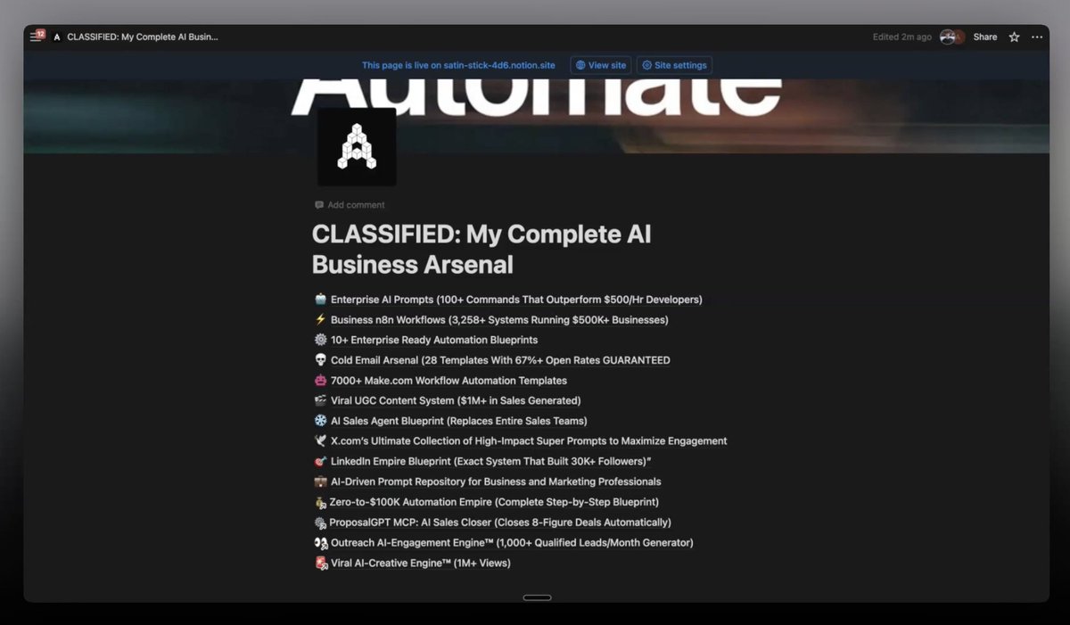 this might be the STUPIDEST thing i've ever done… leaking my ENTIRE automation library here's what you get: – 3,000+ n8n workflows including AI ad creative agents – AI UGC system that saves $247 per video (5-minute creation) – 100+ AI prompts that don't suck – Claude MCP AI agents for LinkedIn automation – AI prompts that write better than most humans – AI Viral Content OS (complete content empire) basically everything you need to automate your business Like + comment “VAULT” + repost (must be following so I can DM you) PS: only FREE for 24hrs before it goes into internal client systems