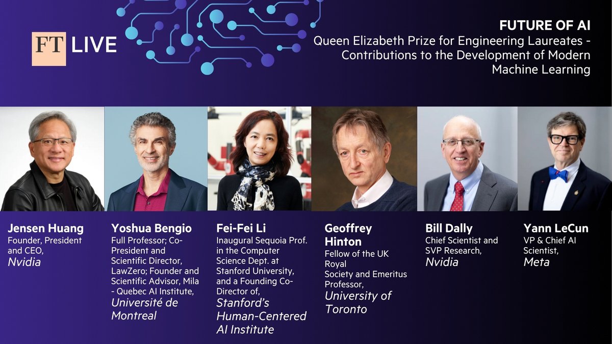 On 6 November, Jensen Huang, @drfeifei, Geoffrey Hinton, Yoshua Bengio, Yann LeCun and Bill Dally will be honoured as this year’s @QEPrize laureates at the FT Future of AI Summit during our day 2 opening panel. Explore: ai.live.ft.com/home #FTFutureofAI #MachineLearning #AI
