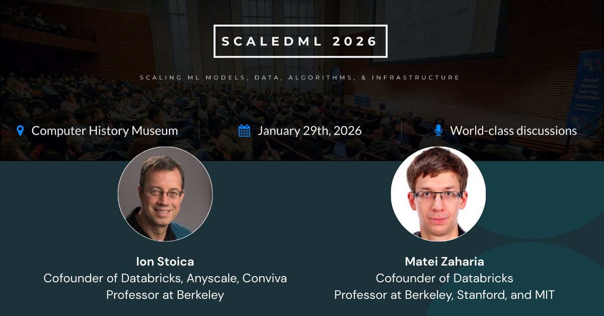 Databricks co-founders @matei_zaharia and @istoica05 will be speaking at #ScaledML 2026! This event brings together the creators behind systems like Apache Spark™, CUDA, TensorFlow, ImageNet, Tesla FSD, and more to explore large-scale learning, distributed systems, and next-generation AI hardware. Join us on January 29th: scaledml.org/
