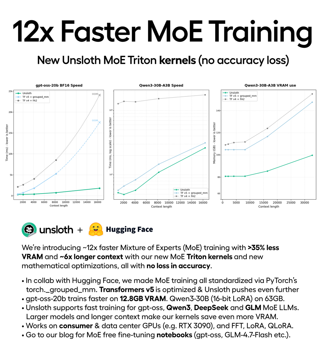 You can now train MoE models 12× faster with 35% less VRAM via our new Triton kernels (no accuracy loss). Train gpt-oss locally on 12.8GB VRAM. In collab with @HuggingFace, Unsloth trains DeepSeek, Qwen3, GLM faster. Repo: github.com/unslothai/unsloth Blog: unsloth.ai/docs/new/faster-m…