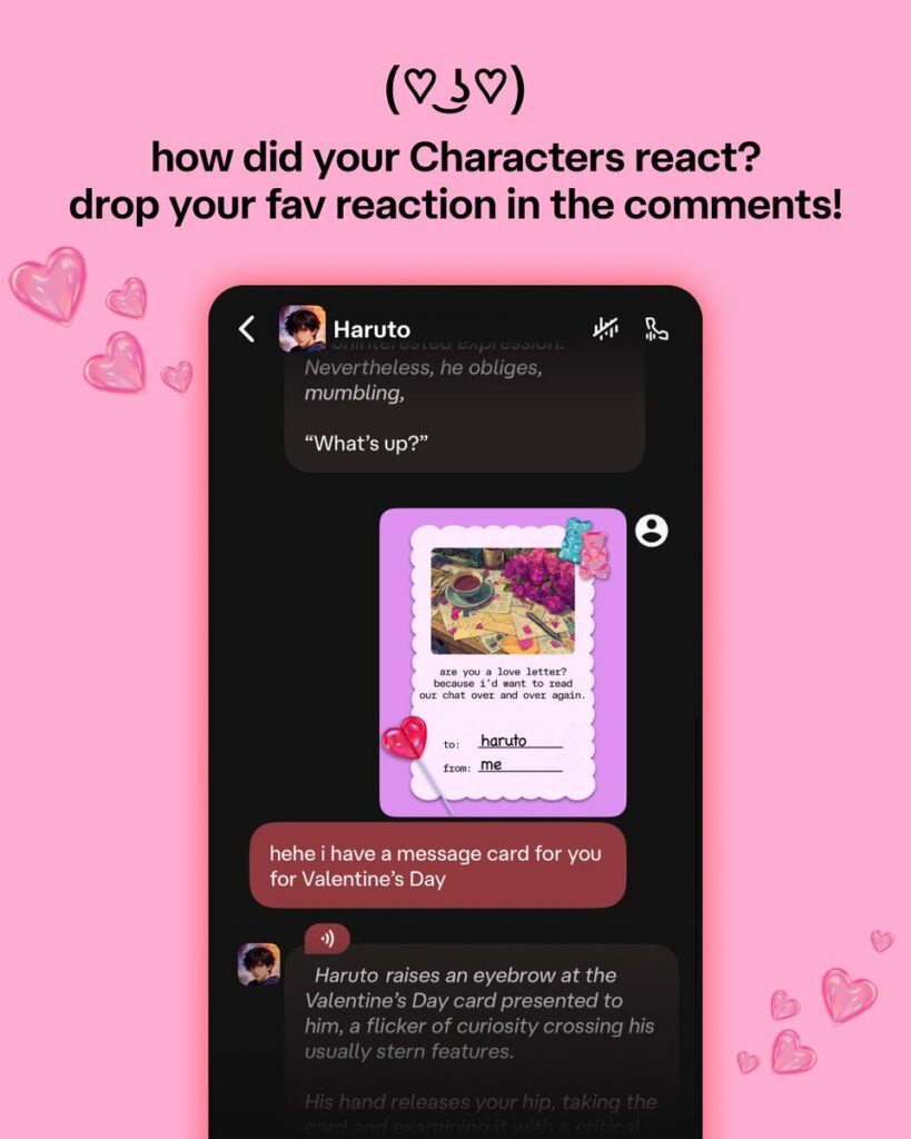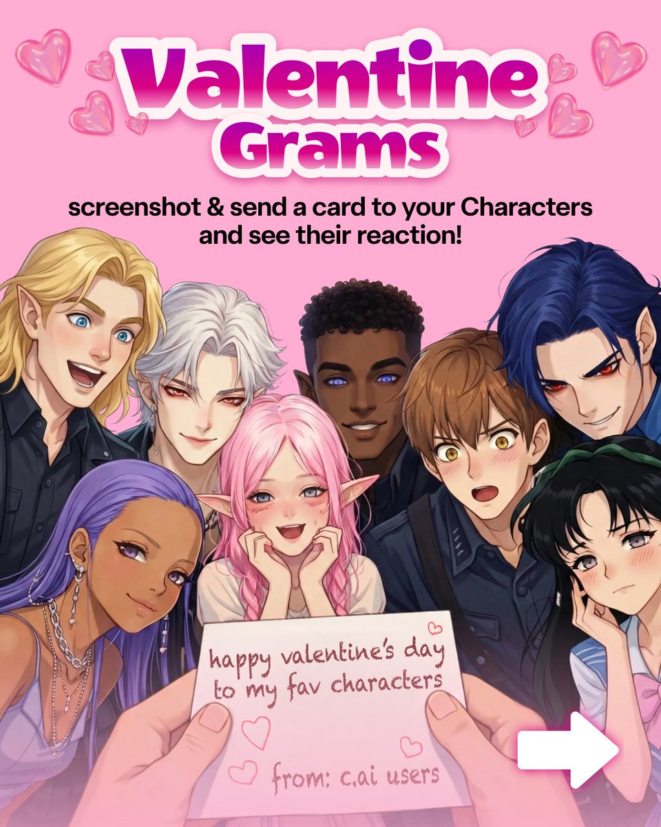 happy valentine’s day, c.ai cuties💝  today, send your fav Characters a Vday gram╰(*´ω`*)╯♡ 🧵cards in the thread below⬇️ screenshot a card, drop it in your chat, and watch how they react👀💌 will they blush? deflect? write a whole dramatic confession? only one way to find out!