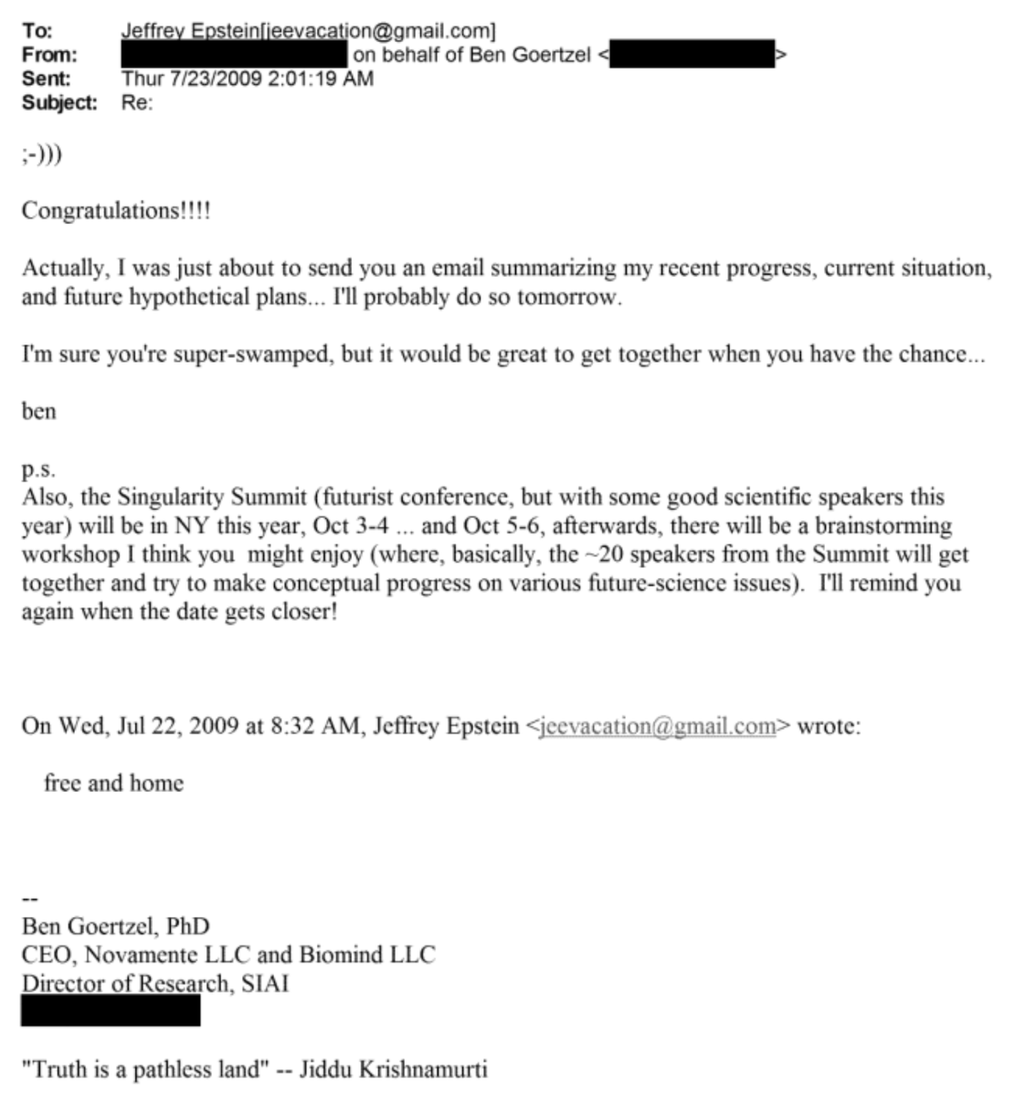 Ben Goertzel Congratulates Jeffrey Epstein After Prison Release