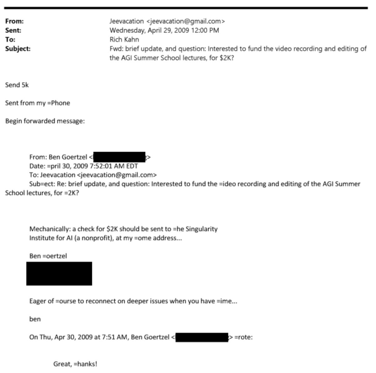 Some notable exchanges: Goertzel requests funding from Epstein while Epstein is in prison. Epstein directs 5k to be sent to the Singularity Institute.