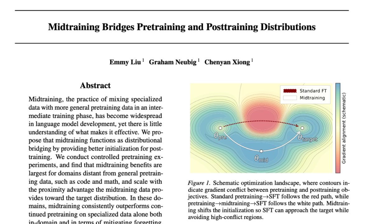 Midtraining is a new part of many training pipelines, but when does it help and can it backfire? π€ In our new preprint, we use controlled experiments to pin this down. TL;DR; midtraining helps the most when it βbridgesβ pretraining and posttraining, and mitigates forgetting after posttraining. Timing is also very important. π§΅