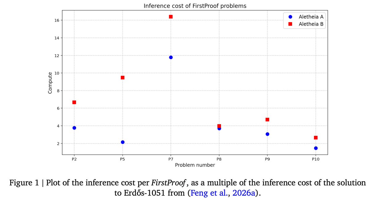 This is a remarkable milestone in which our agent can work on a research problem for a very long time, then come back and tell us if it has succeeded or failed! We visualize the inference cost Aletheia decided to spend on each candidate solution (as a multiple of the inference cost of for solving Erdős-1051, see our previous work nitter.net/lmthang/status/2018354…). P7 is extremely interesting. It has been an open problem for several years, and nobody else came close to solving it in the FirstProof contest per @tonylfeng. We initially thought Aletheia had no chance; turned out it was right! Aletheia spent most compute on P7, 16x amount we used for Erdős-1051. Remarkably, per @kimshmath, "This was the first case that I have ever seen that an AI applies several deep mathematical results (by Cartan/Leray/Borel/Atiyah/Quillen/Novikov/Kasparov…) flawlessly. It is a very unique instance."