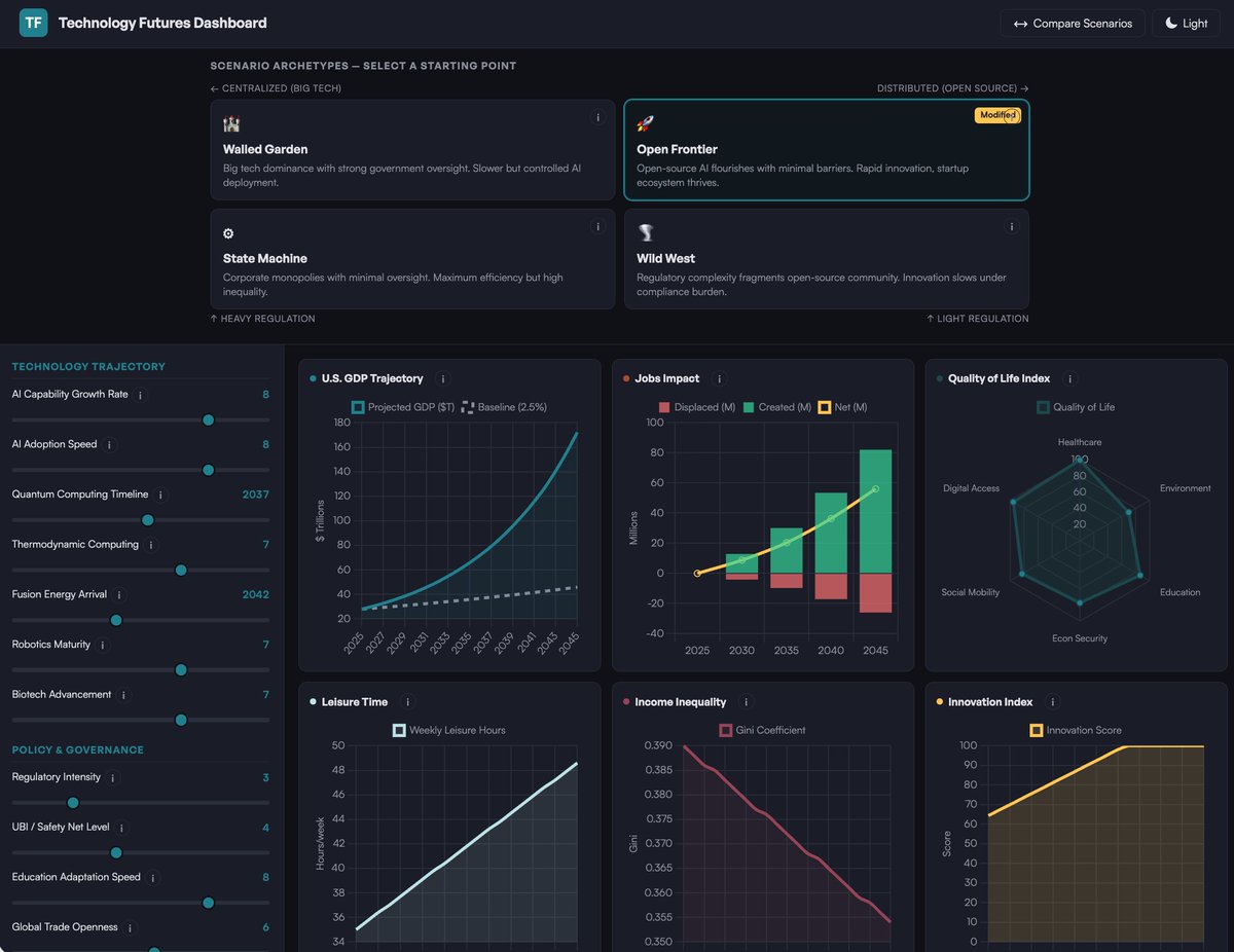 Just having fun here, built this with Perplexity Computer. It is an answer to doomer fictions like ai-2027. This is an interactive guide to the future of AI that enables more realistic scenario planning based both on the realities of AI's economic benefit and your inputs and judgement on the rate of technological control, AI regulation and overall technological change. This chose your own adventure dashboard can help you better conceptualize the incredible economic growth and benefits to humanity coming through technology acceleration. bobgourley.github.io/technol…