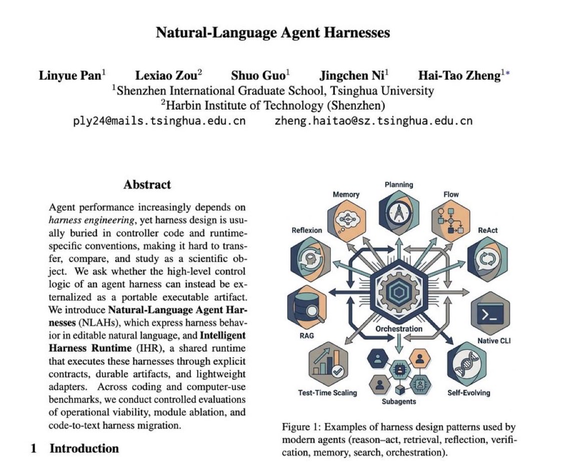 We’re trying to build intelligent systems… using control frameworks designed by humans. That’s the core limitation of today’s agent harnesses. A new paper from Tsinghua University and Shenzhen proposes something radically different: 👉 What if the harness itself is not code—but natural language? Instead of hardcoding orchestration logic, they introduce Natural-Language Agent Harnesses (NLAH): – The control logic is written as an editable natural language SOP – The LLM interprets and executes that SOP dynamically – A shared runtime enforces structure via contracts, artifacts, and adapters Even more interesting: ➡️ The SOP itself can be generated and adapted by AI depending on the task So instead of: > Humans define → Agents execute We get: > AI defines → AI executes → AI evolves 🧠 Technical takeaway This shifts agent design from: – Static orchestration graphs – Hardcoded tool pipelines – Rigid planner-executor loops To: – Executable natural language control logic – Runtime-interpreted orchestration – Portable, composable harness artifacts The harness is no longer buried in code—it becomes a first-class abstraction. 🏗️ Architecture implications – Decouple control logic from implementation – Treat orchestration as data, not code – Use LLMs as meta-execution engines – Design systems that scale with tokens, not constraints 💡 Bigger question If agents can define and execute their own control logic… What else in AI system design should stop being code—and start being language? 📄 Paper: arxiv.org/abs/2603.25723 🔗 Follow my communities and personal initiatives: • Amazing AI, Data, Quantum Computing & Emerging Technologies — drdebashisdutta.com/ • Research & Innovation – Quantum, AI & Advanced Systems — researchedge.org