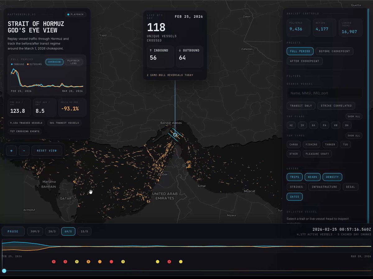 prediction market to bet on how many ships are let through the strait of hormuz. who's building this? Bilawal Sidhu (@bilawalsidhu) Visualizing the Strait of Hormuz shutdown using AIS tracking data. Wild to see the precipitous drop off in transits from 100's of vessels per day to a handful. The craziest part is zooming in to track a single Indian LPG tanker and watching it intentionally go dark — turning off its AIS to sneak through the chokepoint, before popping right back on the radar on the other side. OSINT is too much fun. Pulling this together to a bigger 4D god's eye view of the gulf region. — https://nitter.net/bilawalsidhu/status/2038143105493348730#m
