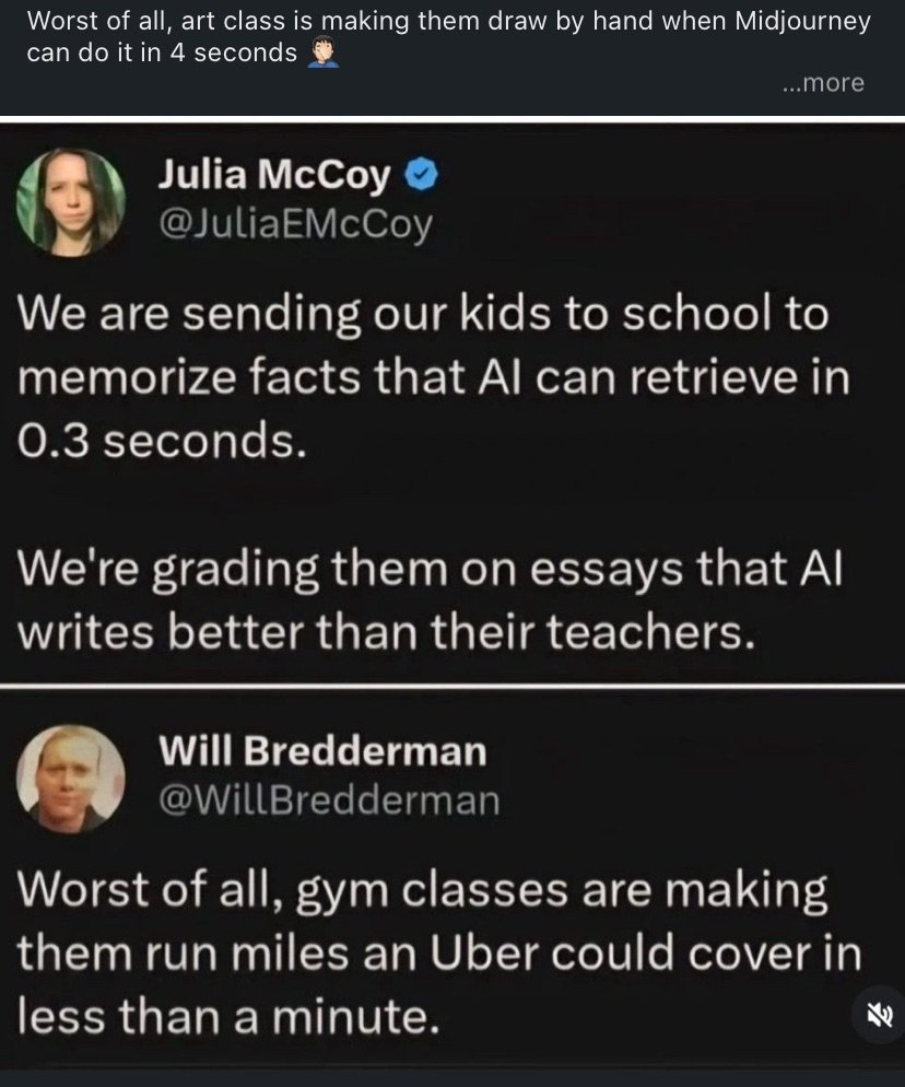 I sincerely hope the first take in this post is trolling. Yes, school should evolve. Of course it should. AI changes what we do and how we do it. But the point of education was never just memorizing facts or producing perfectly formatted essays. It is learning how to think, how to question, how to analyze, how to work with others, how to struggle through a hard problem, and how to grow. Calculators did not make math useless. Computers did not make learning obsolete. And AI will not make education irrelevant. What we teach will keep changing. It has to. But learning itself still matters. A lot. So do attention, discipline, curiosity, friendship, and the ability to build your own mind before outsourcing everything to a machine. Use AI in school, absolutely. But do not confuse using a tool with becoming educated. I’m Louis-François, PhD dropout, now CTO & co-founder at Towards AI. Follow me for tomorrow’s no-BS AI roundup 🚀