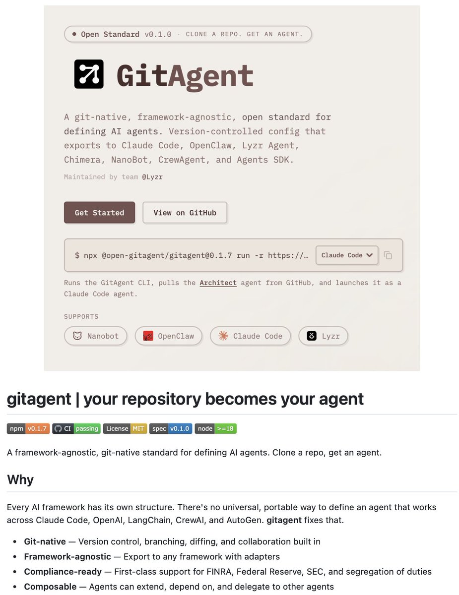 Turn any git repo into an AI agent! GitAgent is a framework-agnostic standard that lets you define agents as git repositories. Every AI framework has its own structure. Claude Code, OpenAI, LangGraph, CrewAI, AutoGen all use different formats. You build an agent in one framework and it's locked there. No portability. No reuse. GitAgent fixes this. Your repository becomes your agent. Drop two files into a git repo (agent.yaml for the manifest, SOUL. md for identity) and it becomes a portable agent definition. Export it to any framework with adapters. You get git's workflow for free. Version control your prompts. Roll back broken changes with git revert. Fork public agents, customize them, and PR improvements back. Run gitagent validate in GitHub Actions to catch issues before deployment. The structure is flexible. Start with just agent.yaml and SOUL. md. Add skills, tools, workflows, memory, and compliance rules as you need them. Everything is optional except those two core files. It works across frameworks. Export to Claude Code, OpenAI Agents SDK, CrewAI, or as a raw system prompt. Same agent definition, different runtimes. Built for compliance. First-class support for FINRA, Federal Reserve, and SEC requirements. Segregation of duties built into the spec. Define roles, conflict matrices, and handoff workflows in agent.yaml. Link to the Github Repo in comments!