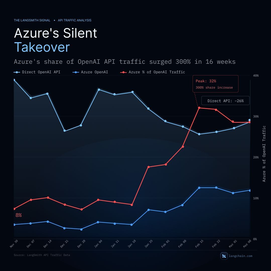 The LangSmith Signal: Azure's share of OpenAI traffic grew nearly 4x in under 3 months. We're sharing how devs are building agents, by the numbers. While most orgs started by connecting directly to OpenAI, over the past 10 weeks we've watched Azure's share of that traffic grow from 8% to 29%. We've analyzed this trend via LangSmith Observability data across more than 6.7 billion agent runs. Our hypothesis: 💡 Early adopters moved fast and went direct, but the enterprise wave is now arriving in force 💡 Azure gives teams the compliance, security, and procurement infrastructure they already have in place 💡 Azure traffic 4x-ing in 10 weeks likely indicates AI development is maturing quickly