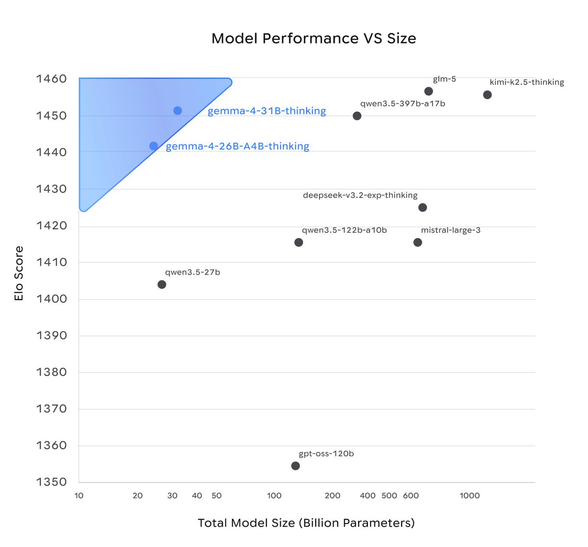 Gemma 4 outperforms models over 10x their size! (note the x-axis is log scale!) [Translated from EN to English]