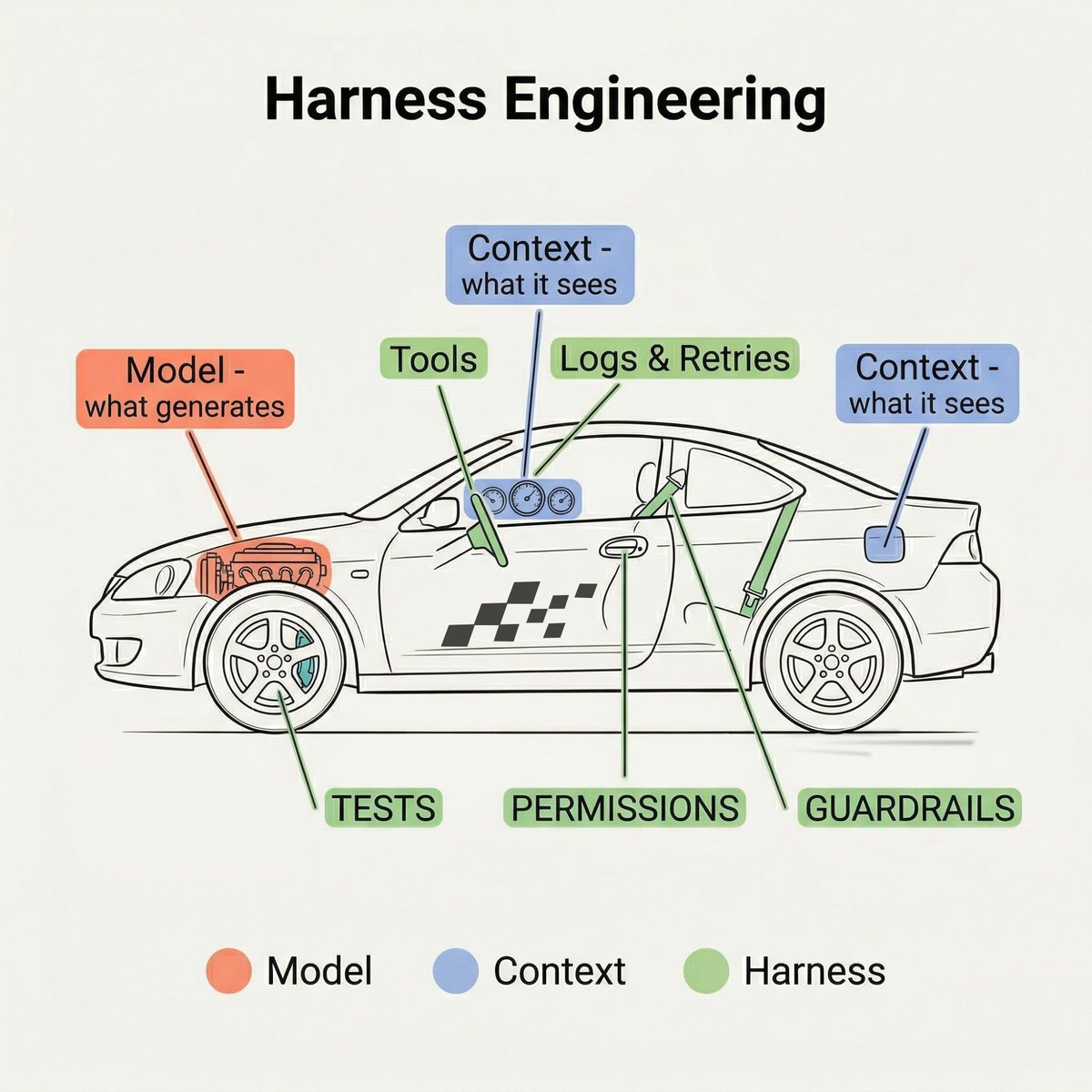 I let Claude Code loop for 45 minutes while I was at the gym. Came back. It told me the feature was done. It wasn't. It hadn't even run the tests. Not because the model is dumb. Because I wrapped it in nothing but a loop and a dream. That's harness engineering in one sentence. And no, it's not prompt engineering with a fancier name. The model is the engine. Context is the fuel. The harness is the rest of the car. Steering. Brakes. Lane boundaries. Warning lights. Tools, permissions, tests, retries, guardrails. Engine + fuel but not strong parts in it = dangerous car. So I stopped tuning the engine and started building the car around it. In every skill file (Claude Code, Claude Co-work), I added one last step. After each interaction, the agent reflects on what I liked, what I edited, what failed. Then it updates its own skill to be better next time. Token usage dropped (a lot). Output quality went up. Compounding improvement with zero extra effort from me. LangChain did something similar at a bigger scale. Changed only the harness on a coding agent. Same model. Went from outside the top 30 to top 5 on a benchmark. Same engine, completely different results, just because the car around it was better. Next time your agent breaks, don't blame the model. Fix the car. P.S. Do your agents learn from their mistakes, or do they keep making the same ones?