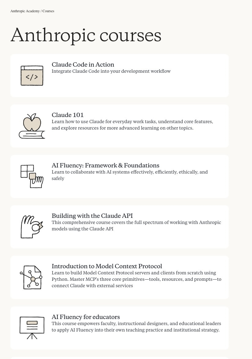 bro dropped 6 figures on a degree just to end up on the same free Claude certs as us Charly Wargnier (@DataChaz) Did you know @claudeai has 13 AI courses and certificates available COMPLETELY FREE? You can jump in and start learning right away. #1 Claude 101 → anthropic.skilljar.com/claud… #2 AI Fluency: Frameworks & Foundations → anthropic.skilljar.com/ai-fl… #3 Introduction to Agent Skills → anthropic.skilljar.com/intro… #4 Building with the Claude API → anthropic.skilljar.com/claud… #5 Claude Code in Action → anthropic.skilljar.com/claud… #6 Intro to Model Context Protocol → anthropic.skilljar.com/intro… #7 MCP: Advanced Topics → anthropic.skilljar.com/model… #8 AI Fluency for Students → anthropic.skilljar.com/ai-fl… #9 AI Fluency for Educators → anthropic.skilljar.com/ai-fl… #10 Teaching AI Fluency → anthropic.skilljar.com/teach… #11 AI Fluency for Nonprofits → anthropic.skilljar.com/ai-fl… #12 Claude with Amazon Bedrock → anthropic.skilljar.com/claud… #13 Claude with Google Cloud Vertex AI → anthropic.skilljar.com/claud… — https://nitter.net/DataChaz/status/2041032604149846422#m