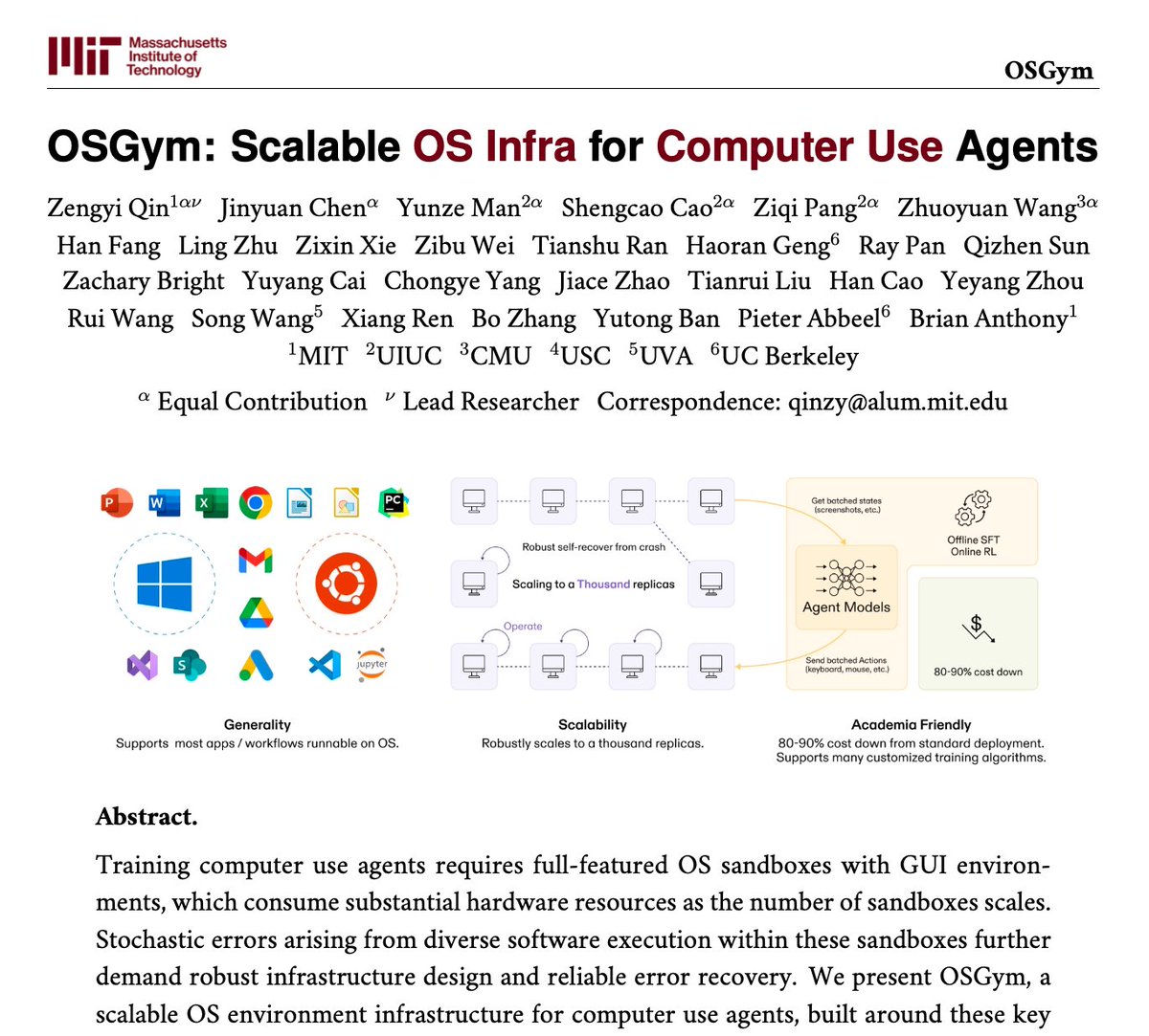 How do you train AI agents that can use computers like humans? 🧵 MIT CSAIL researchers introduce "OSGym": scalable OS infrastructure to improve the capabilities of computer use agents. It introduces large-scale training made possible by extensive infrastructure optimization: bit.ly/47JprPd [Translated from EN to English]