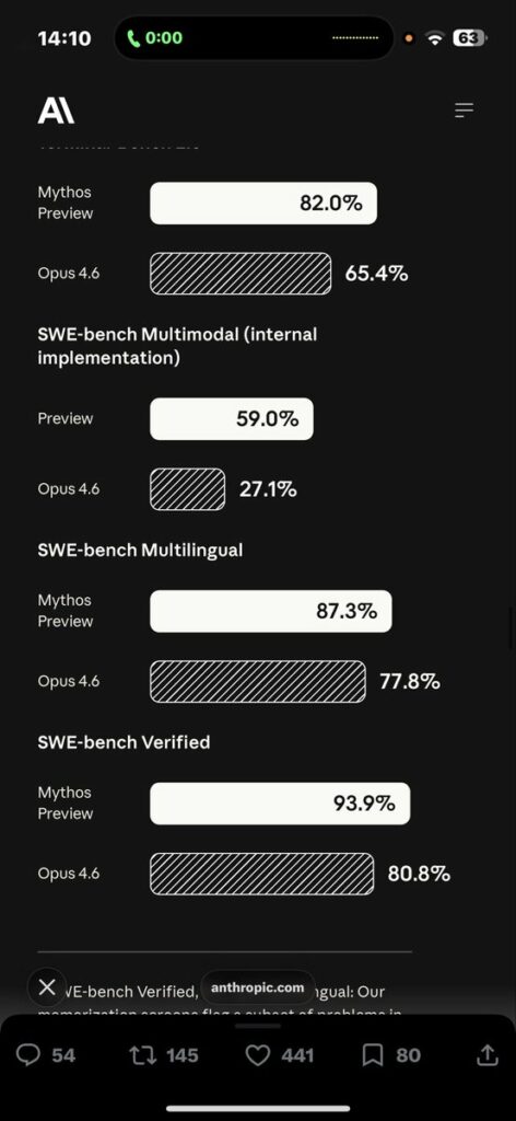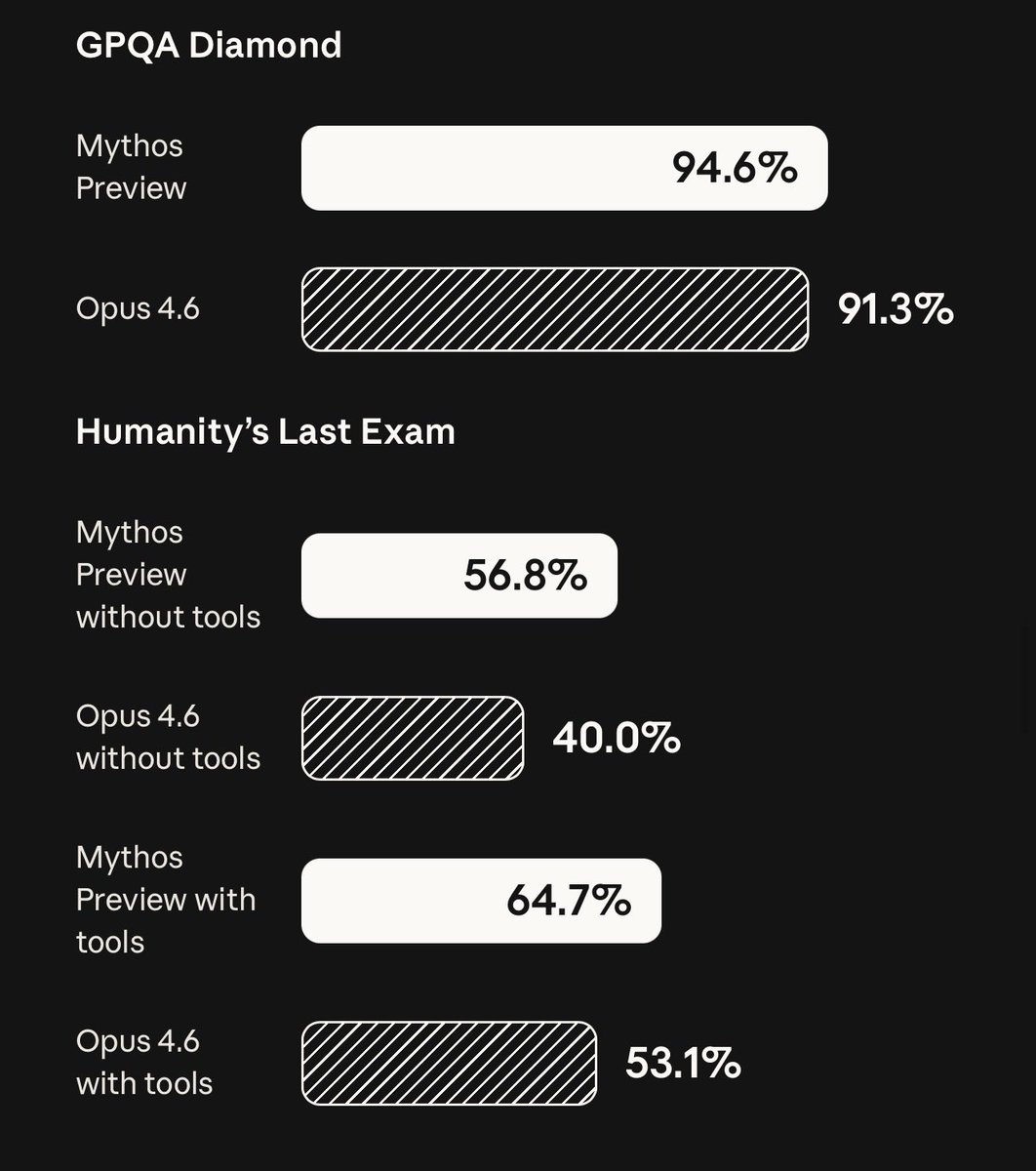 π¨ ANTHROPIC JUST BROKE SWE-BENCH PRO WITH CLAUDE MYTHOS π¨ Anthropic just dropped the numbers for their unreleased "Claude Mythos Preview" and the coding leap is almost incomprehensible. This model is so powerful at finding exploits that they are keeping it strictly locked down for critical infrastructure partners. Anthropic explicitly stated: "Weβve used Claude Mythos to demonstrate thousands of zero day vulnerabilities." Look at the absolute destruction of these benchmarks compared to Opus 4.6: β’ SWE-Bench Pro: 77.8% (Destroying Opus 4.6 at 53.4%) β’ Terminal-Bench 2.0: 82.0% (Up from 65.4%) β’ SWE-Bench Verified: 93.9% β’ SWE-Bench Multimodal: 59.0% (More than double Opus 4.6's 27.1%) β’ Humanity's Last Exam (with tools): 64.7% (Up from 53.1%) β’ GPQA Diamond: 94.6% A nearly 25-point jump in SWE-Bench Pro in a single generation. And weβre in *checks notes* April..