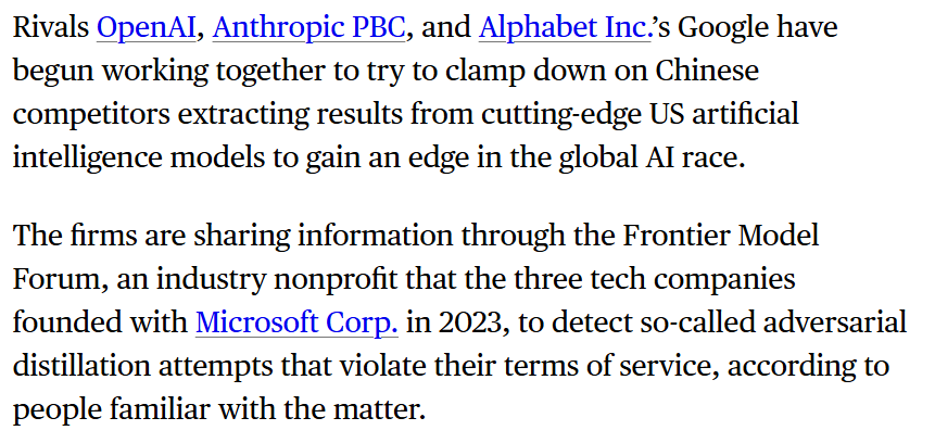 AI2027 was correct again: OpenAI, Anthropic, and Google are teaming up to stop Chinese competitors from extracting (distillation) and replicating outputs from advanced AI models. Through the Frontier Model Forum, they're sharing intelligence to detect misuse and protect their technological edge in the global AI race. [Translated from EN to English]