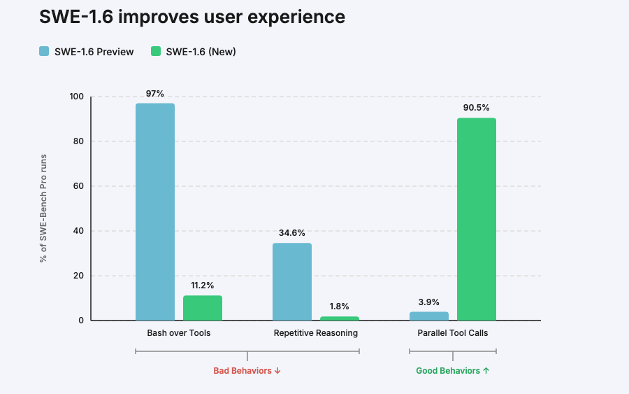 We’re releasing SWE-1.6, our best model in both intelligence & model UX. SWE-1.6 matches our Preview model on SWE-Bench Pro while dramatically improving on various behavioral axes. It’s available today in Windsurf in two modes: free tier (200 tok/s) and fast tier (950 tok/s).