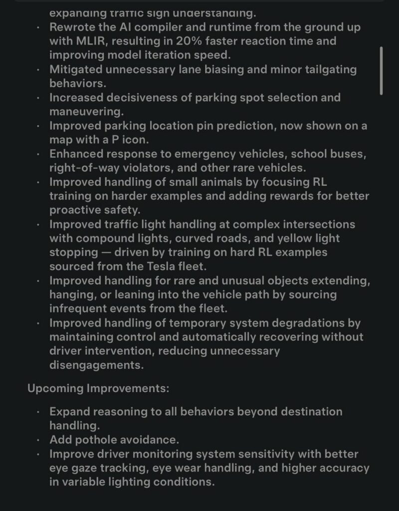 BREAKING: Tesla has officially released FSD V14.3 I'm downloading it in my Model Y right now. Here's everything that's new: • Improved parking location pin prediction, now shown on a map with a P icon. • Increased decisiveness of parking spot selection and maneuvering. • Rewrote the Al compiler and runtime from the ground up with MLIR, resulting in 20% faster reaction time and improving model iteration speed. • Enhanced response to emergency vehicles, school buses, right-of-way violators, and other rare vehicles. • Mitigated unnecessary lane biasing and minor tailgating behaviors. • Improved handling of small animals by focusing RL training on harder examples and adding rewards for better proactive safety. • Improved traffic light handling at complex intersections with compound lights, curved roads, and yellow light stopping – driven by training on hard RL examples sourced from the Tesla fleet. • Upgraded the Reinforcement Learning (RL) stage of training the FSD neural network, resulting in improvements in a wide variety of driving scenarios. • Upgraded the neural network vision encoder, improving understanding in rare and low-visibility scenarios, strengthening 3D geometry understanding, and expanding traffic sign understanding. • Improved handling for rare and unusual objects extending, hanging, or leaning into the vehicle path by sourcing infrequent events from the fleet. • Improved handling of temporary system degradations by maintaining control and automatically recovering without driver intervention, reducing unnecessary disengagements. Upcoming Improvements: • Expand reasoning to all behaviors beyond destination handling. • Add pothole avoidance. • Improve driver monitoring system sensitivity with better eye gaze tracking, eye wear handling, and higher accuracy in variable lighting conditions.