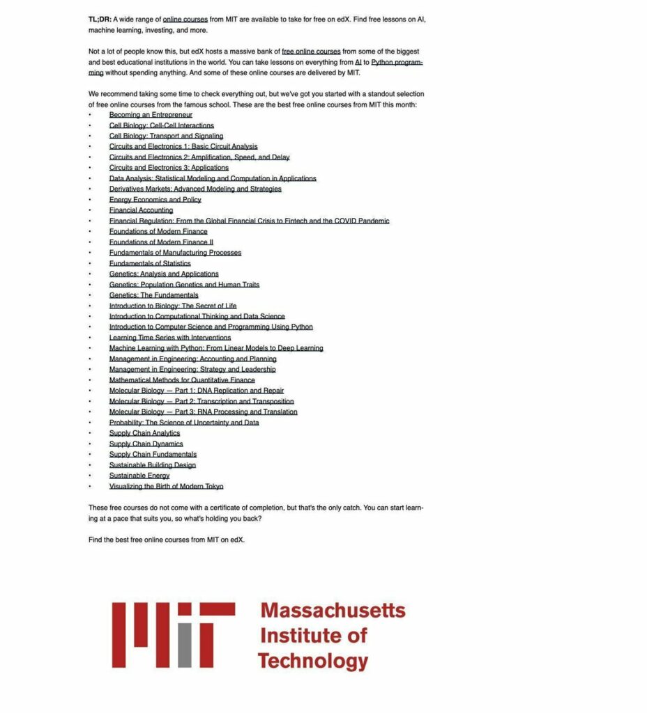 MIT: 35 Best Courses in Machine Learning! @MIT Explore a world of knowledge with free online courses from MIT on edX, featuring lessons in AI, machine learning, computer science engineering, circuits and electronics, Genetics, data science, statistics and much more. Many people are unaware that edX hosts an incredible collection of free online courses from some of the top educational institutions globally. You can dive into everything from AI to Python programming without any cost. A significant number of these courses are crafted by MIT experts. We highly encourage you to take advantage of this opportunity, and to kickstart your learning journey, here’s a curated selection of the best free online courses from MIT that you can explore this month: #BigData #Analytics #DataScience #AI #MachineLearning #IoT #IIoT #PyTorch #Python #RStats #TensorFlow #Java #JavaScript #ReactJS #GoLang #CloudComputing #Serverless #DataScientist #Linux #Programming #Coding #100DaysofCode References Green, J. (2024, December 11). MIT: 35 best courses in machine learning! Mashable. Retrieved December 11, 2024, from mashable.com/article/free-mi…