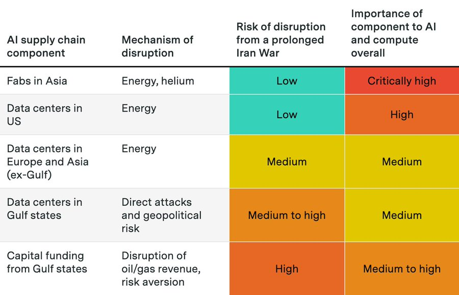 Really interesting: New analysis from @EpochAIResearch on the Iran war's impact on AI: tl;dr The Hormuz shutdown hit 20% of global LNG and ~33% of helium supply, but chipmaking margins are so high that fabs can absorb massive cost spikes. US data centers are insulated from the energy shock entirely. The real risk however: Gulf investment flows drying up as oil revenue drops and geopolitical risk rises, plus direct threats to projects like Stargate UAE. Bottom line: a prolonged conflict slows the buildout at the margins but won't derail it, unless the war escalates dramatically. And this is the real danger. Epoch AI (@EpochAIResearch) The Iran War and Hormuz shutdown have disrupted oil, gas, and helium exports and threatened data centers and investments in the Gulf states. @justjoshinyou13 explores how a prolonged Iran war could affect AI, and why it probably won’t completely derail the compute buildout. — https://nitter.net/EpochAIResearch/status/2042599307493384520#m