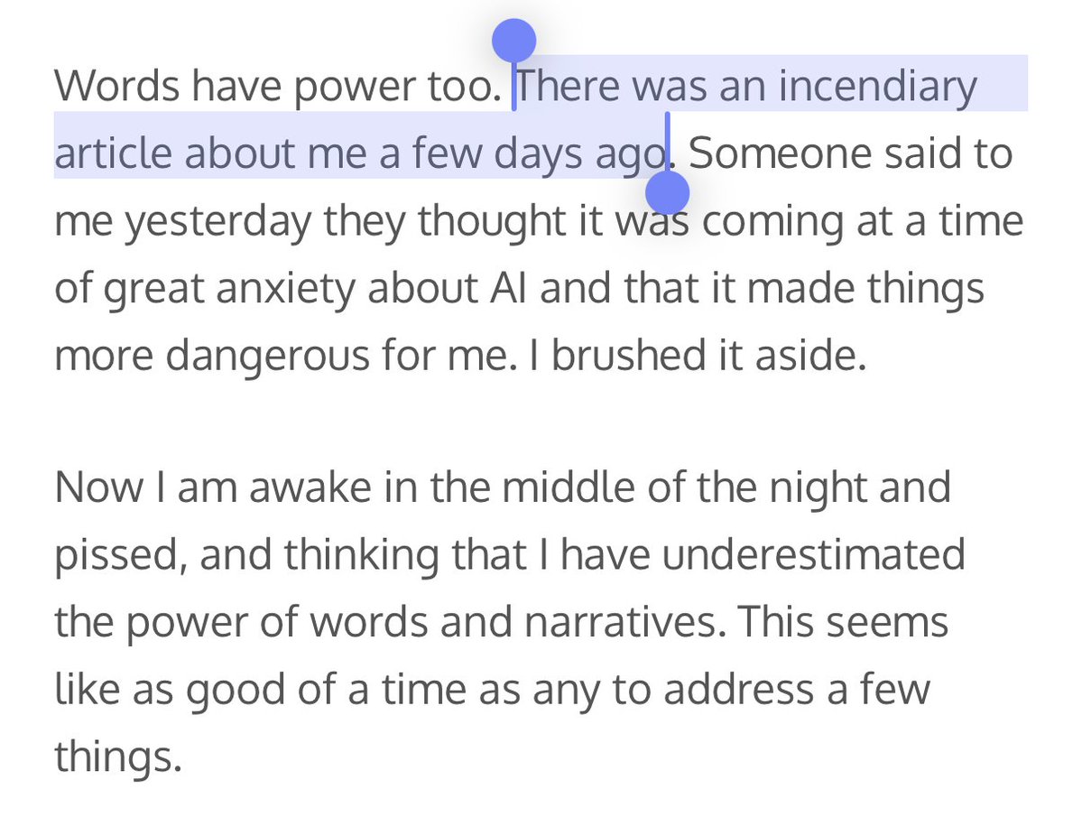 What happened to Sam Altman and his family is really awful. It is hard to reconcile his call to “de-escalate the rhetoric and tactics” with his implication that a piece of critical journalism (Ronan Farrow and Andrew Marantz’s New Yorker article, presumably) was responsible for this. Sam Altman (@sama) I wrote this early this morning and I wasn't sure if I would actually publish it, but here it is: blog.samaltman.com/2279512 — https://nitter.net/sama/status/2042738954550603884#m