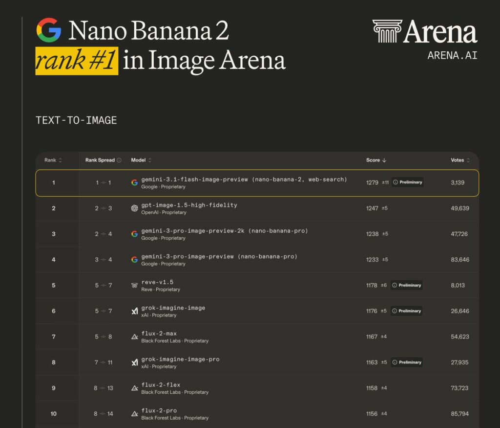 Banana^2 Arena.ai (@arena) 🚨BREAKING: Nano Banana 2 debuts at #1 in Image Arena, and it changes the game again 🍌🍌 Officially released as Gemini 3.1 Flash Image Preview, it is powered by real-time information and images from web search. Highlights: – #1 Text-to-Image scoring 1279, surpassing GPT-Image-1.5 and Nano Banana Pro – Ties for #1 Single-Image Edit, scoring 1407 on par with ChatGPT-Image-Latest – Top 3 Multi-Image Edit, alongside Nano Banana Pro variants – $0.067 per image ~2x cheaper than Nano Banana Pro Congrats to the @GoogleDeepMind team for continuing to push the frontier! — https://nitter.net/arena/status/2027053222876393703#m