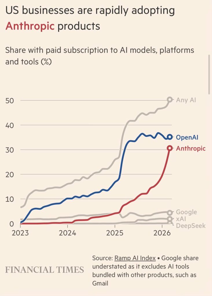 To be honest: I didn’t expect that steep curve of adoption. Anthropic surpassed every prediction and is becoming the number one business product. Ara Kharazian (@arakharazian) NEW: Ramp AI Index out today with FT @tryramp – Anthropic will surpass OpenAI in adoption within a month or so – Businesses shrugged off the DoD security designation — https://nitter.net/arakharazian/status/2042965029377507664#m